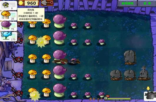 还是先阳光菇和小喷菇,阳光足够就再种一排大喷菇,也可以再种一排寒冰射手。这关出现门板僵尸,它的门板防守力很高,但是在大喷菇的穿透攻击面前也是渣。